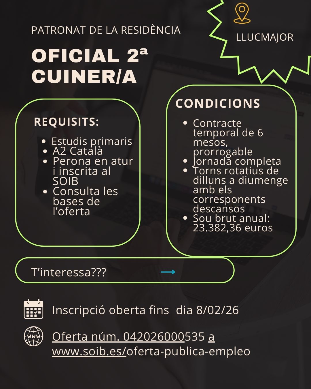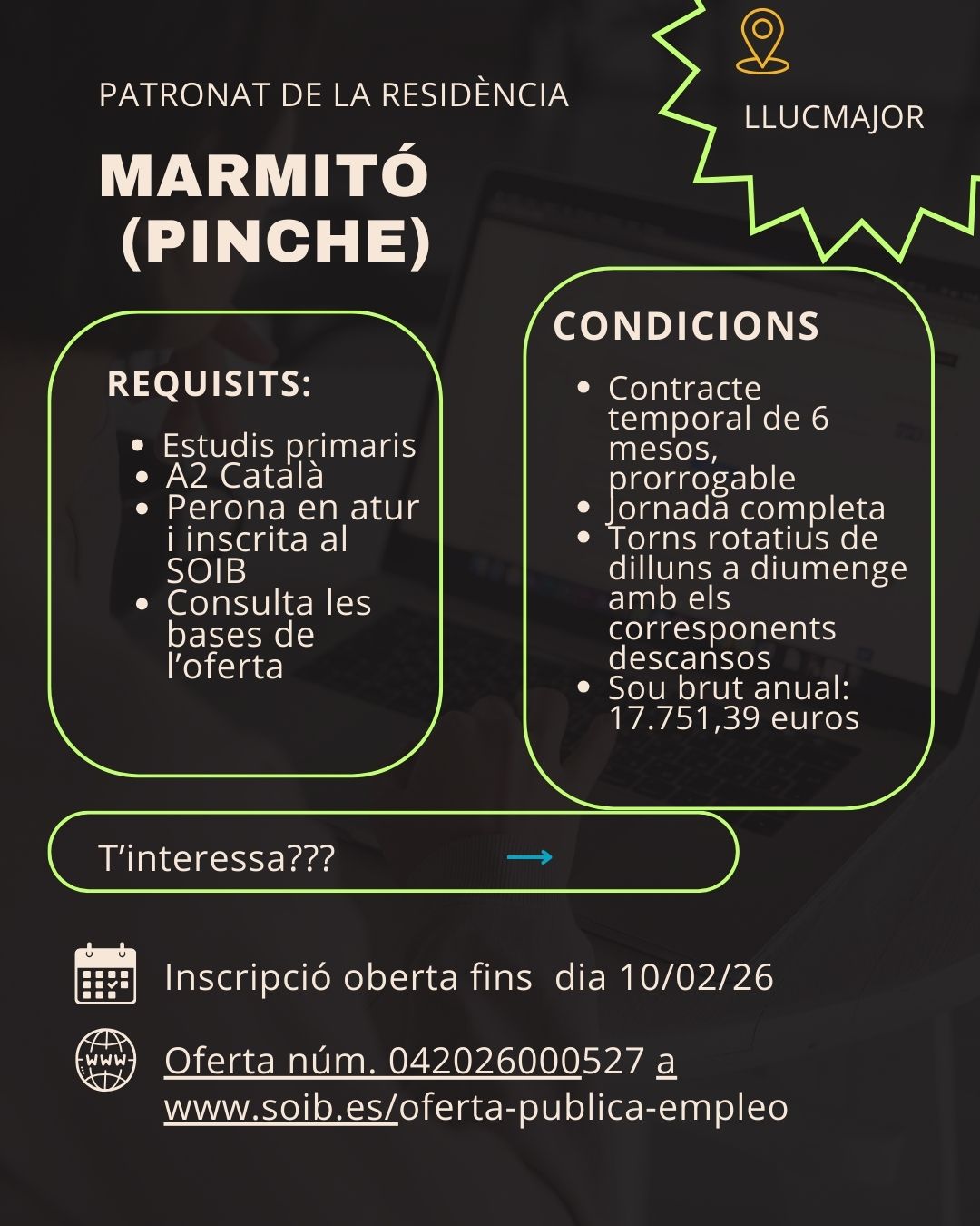 📍 Palma Convocatòria pública per a persona inscrita al SOIB. ⏰ Jornada completa 📅 Contracte temporal de 3 mesos (prorrogable) 💶 Sou anual: 22.716,8 €