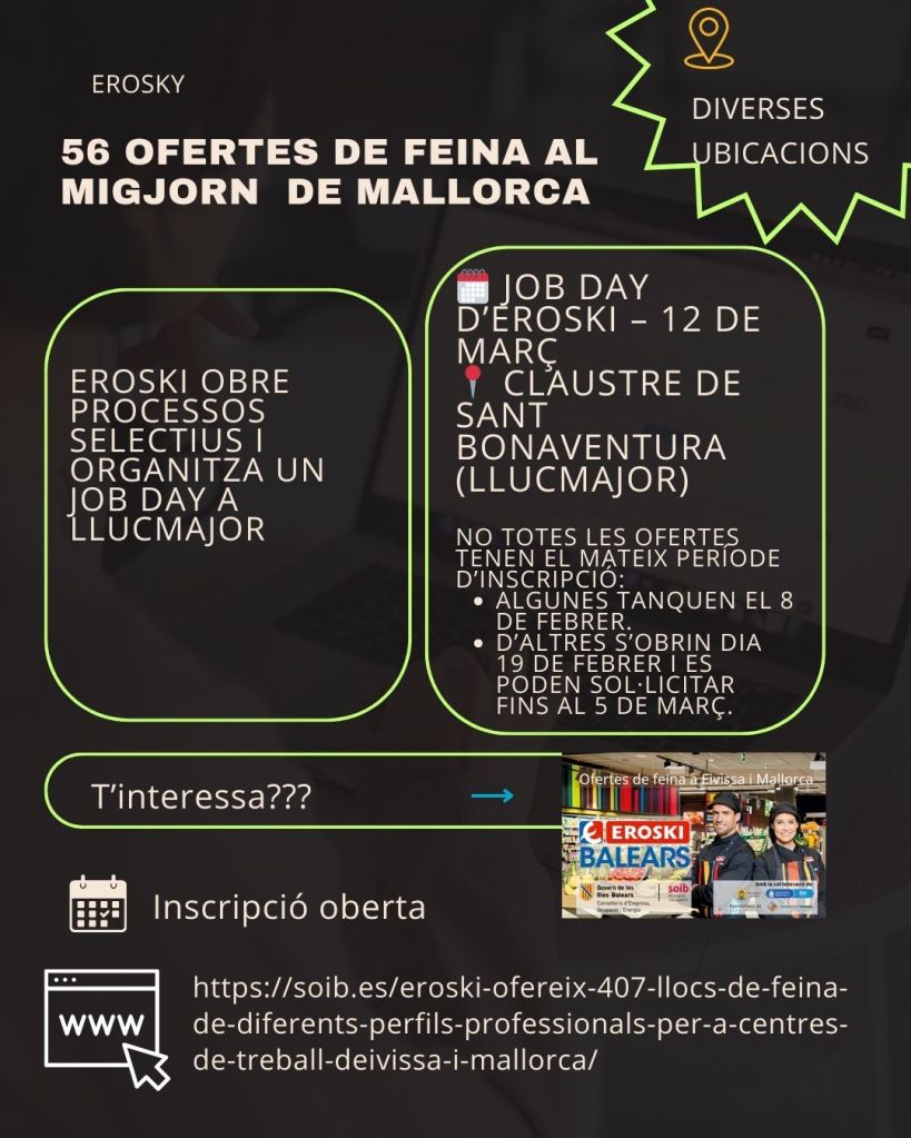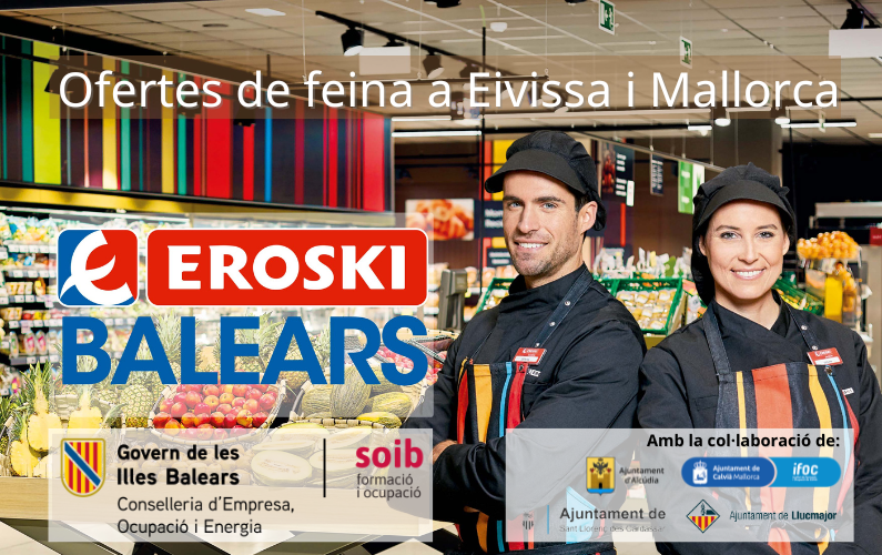 Si vius o cerques feina a la zona d’Es Migjorn de Mallorca, tens una nova oportunitat laboral molt interessant. El grup Eroski ha publicat 56 llocs de feina repartits entre les poblacions de Felanitx, Portocolom, Cala d’Or, Santanyí, Colònia de Sant Jordi, Llucmajor i Campos. Aquestes vacants formen part d’una convocatòria més àmplia, amb un total de 407 ofertes entre Mallorca i Eivissa.