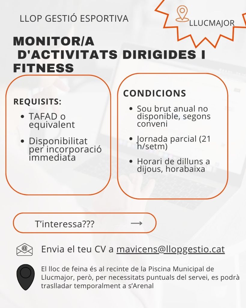 Empresa: Llop Gestió Esportiva Requisits: TAFAD o equivalent i disponibilitat immediata. Condicions: Jornada parcial (21 h/setmana) i horari de dilluns a dijous horabaixa. 📍 El lloc de feina és a la Piscina Municipal de Llucmajor, amb possibles trasllats puntuals a s’Arenal.