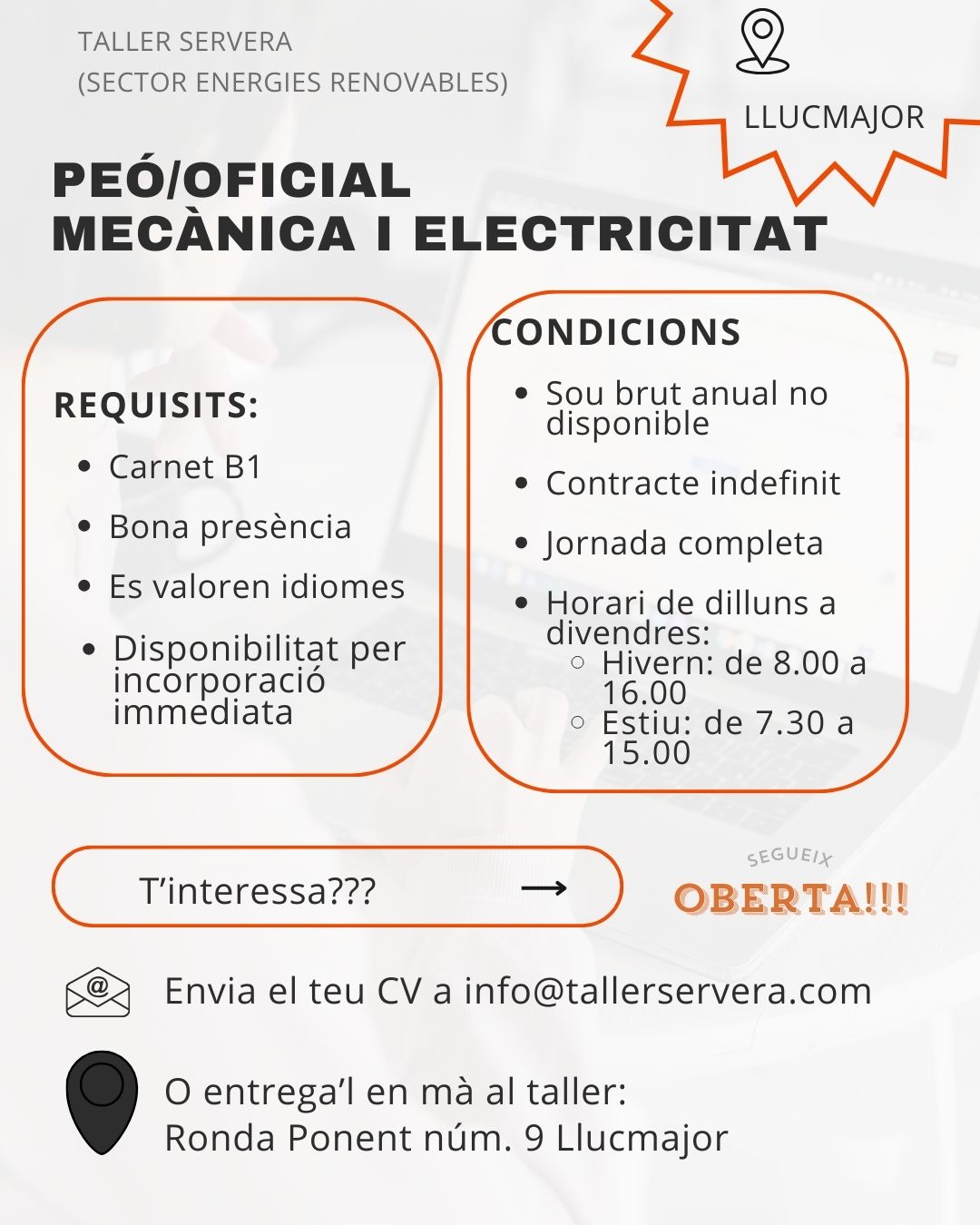 Empresa: Taller Servera Requisits: carnet B1, bona presència i disponibilitat immediata. Contracte indefinit i jornada completa (horari diferent a hivern/estiu). 📨 Enviament de CV a info@tallerservera.com