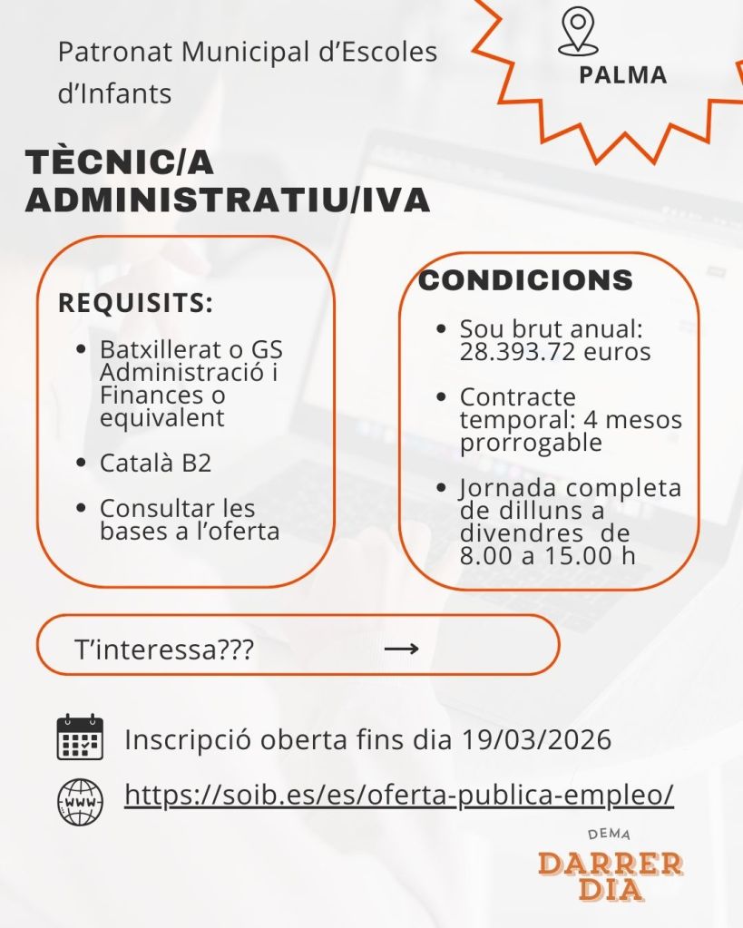 Requisits: Batxillerat o FP d’Administració i Finances + Català B2. Jornada completa i contracte temporal de 4 mesos prorrogable. 📅 Inscripció fins al 19/03/2026.