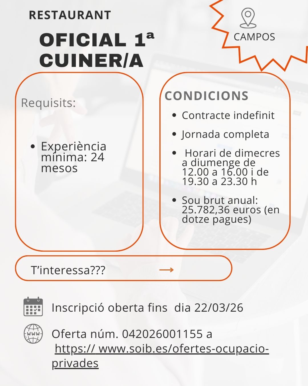Contracte indefinit i jornada completa. Sou brut anual: 25.782,36 € 📅 Inscripció fins al 22/03/2026.