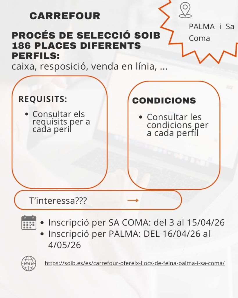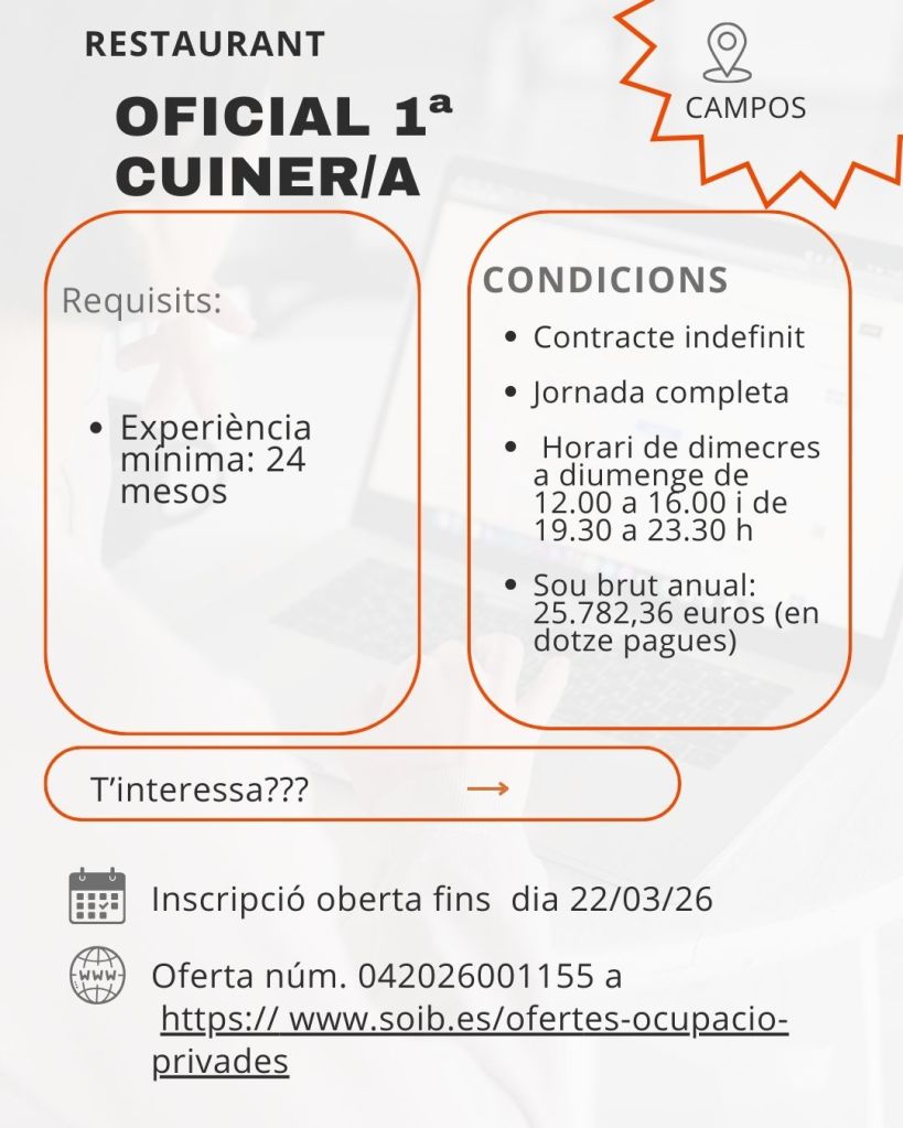 Tot i que la setmana passada no es va poder publicar el recull, aquí tens un resum complet i actualitzat de totes les ofertes disponibles als municipis de Llucmajor, Campos, Palma i zones properes. Si cerques feina o vols compartir una oferta, aquest és el teu espai!