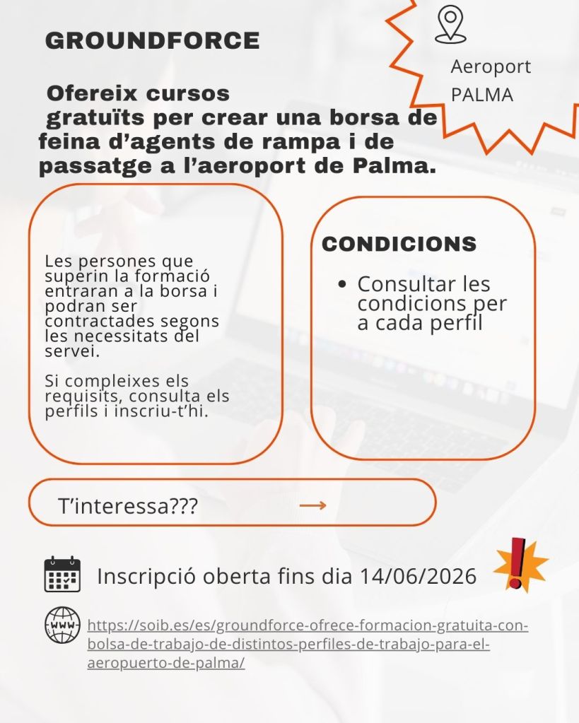 Per a perfils d’agent de rampa i agent de passatge a l’aeroport de Palma. Les persones que superin el curs entraran a una borsa amb possibles contractacions segons necessitats del servei. 📅 Inscripció oberta fins al 14/06/2026.
