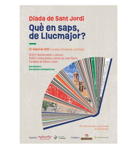 Vine dia 23 d’abril a les 18:00 hores a plaça i participa al concurs “Què en saps, de Llucmajor?”, on podràs demostrar els teus coneixements sobre la vila i molts d’altres temes d’història, literatura, cinema, teatre i un llarg etcètera.