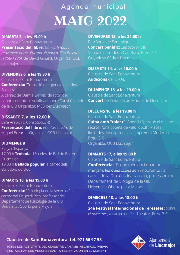 Agenda mes de MAIG Publicat el 2 Mai 2022 per #enClauJove Ajuntament de Llucmajor Comparteix això: Feu clic per compartir a X (S'obre en una nova finestra) X Feu clic per compartir al Facebook (S'obre en una nova finestra) Facebook M'agrada S'està carregant... Relacionats