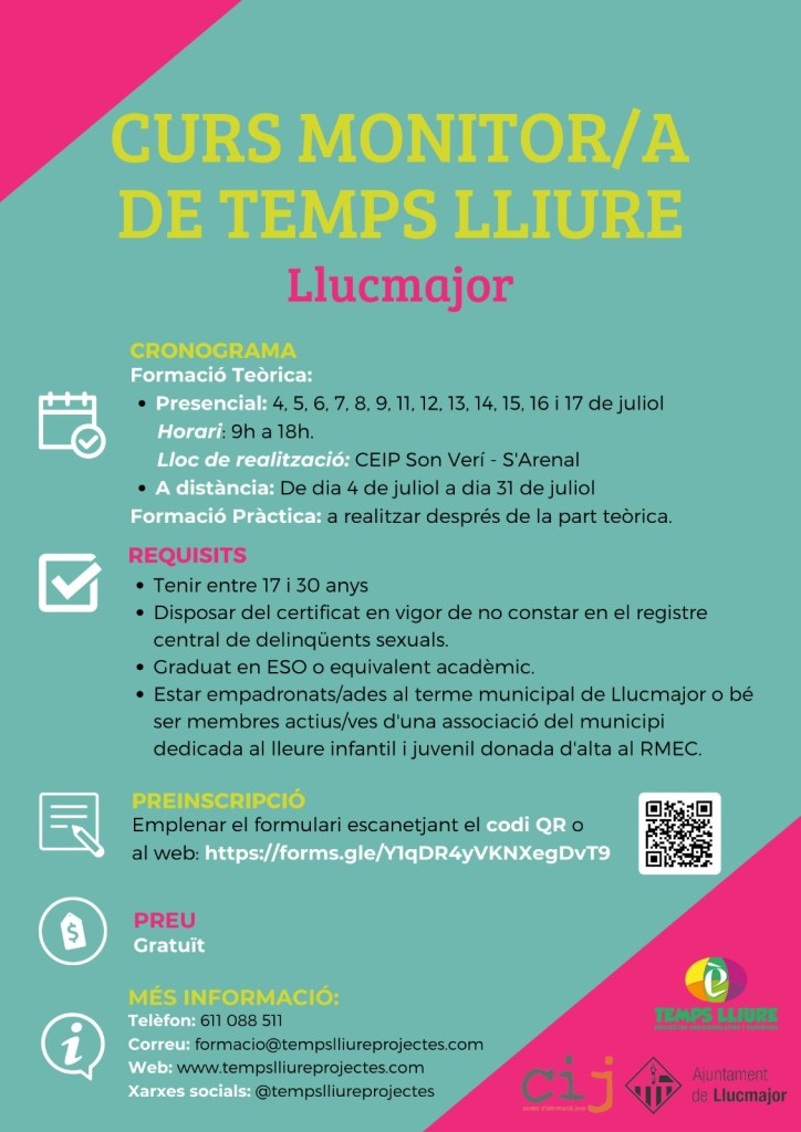 L’Ajuntament de Llucmajor ha organitzat un curs de monitor-a de temps lliure semi intensiu i en modalitat mixta: presencial i a distància. Es durà a terme el mes de juliol, a S’Arenal. El curs és gratuït.