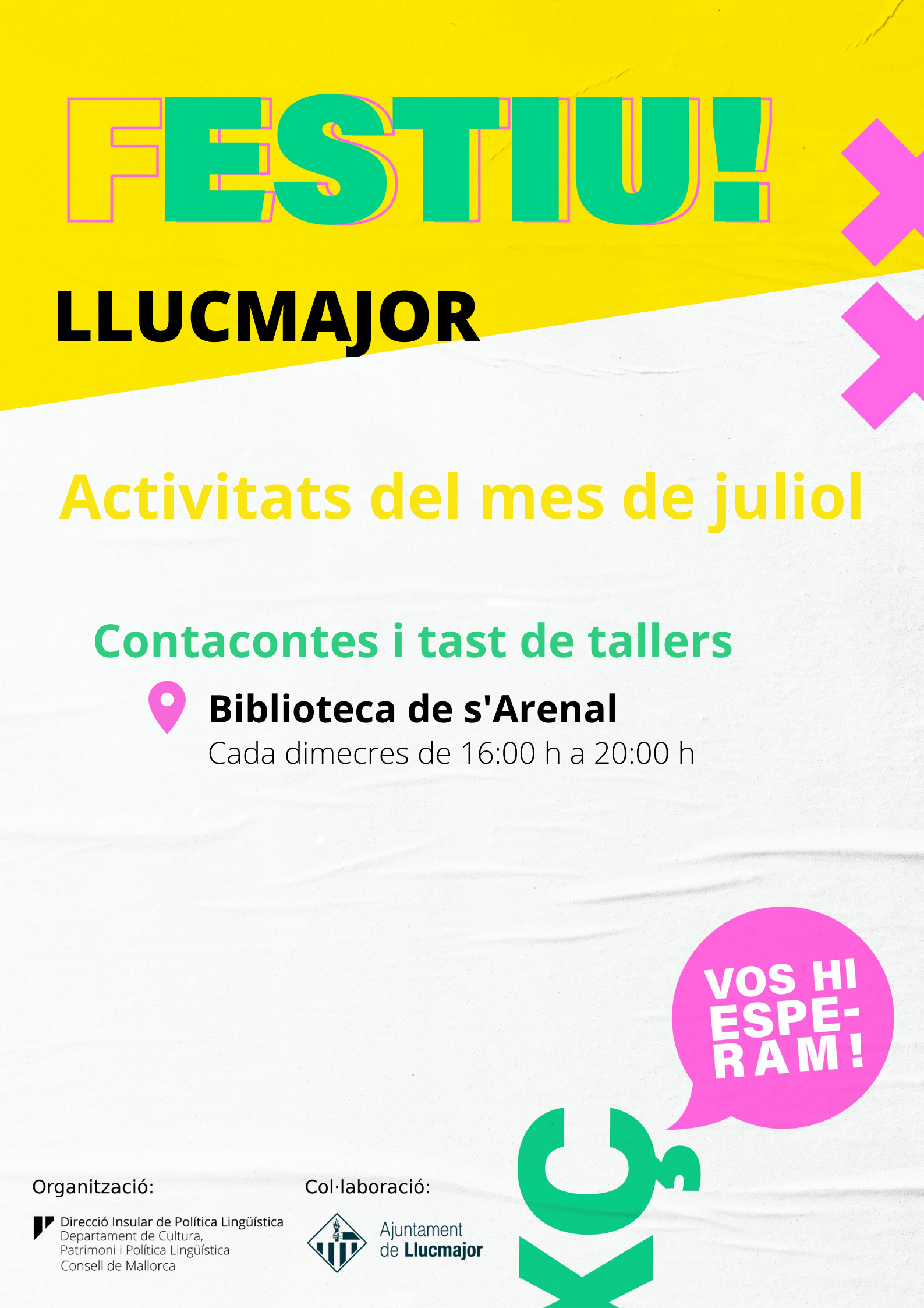 FESTIU a s’Arenal: Contacontes i tast de tallers Imatge Publicat el 8 Juliol 2022 per #enClauJove Ajuntament de Llucmajor Comparteix això: Feu clic per compartir a X (S'obre en una nova finestra) X Feu clic per compartir al Facebook (S'obre en una nova finestra) Facebook M'agrada S'està carregant... Relacionats