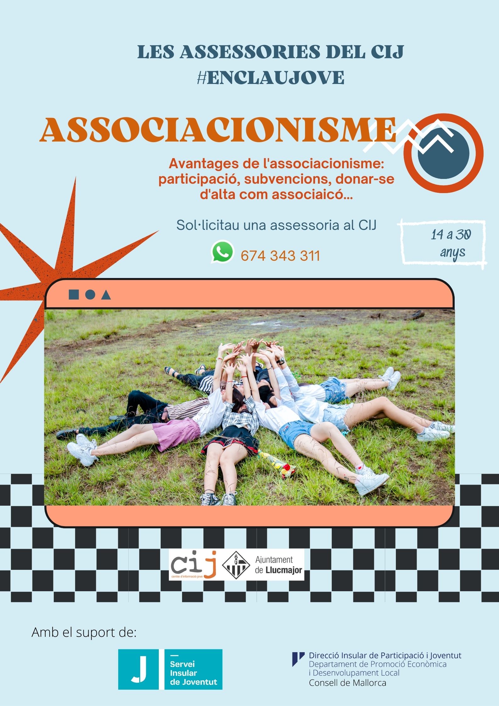 - Assessoria Associacionisme: el món associatiu ofereix moltes oportunitats de participació del jovent en la vida social i comunitària. Vols saber com es monta una associació juvenil? Vols conèixer les avantatges de l’associacionisme? Heu de demanar una subvenció? (14-30 anys)
