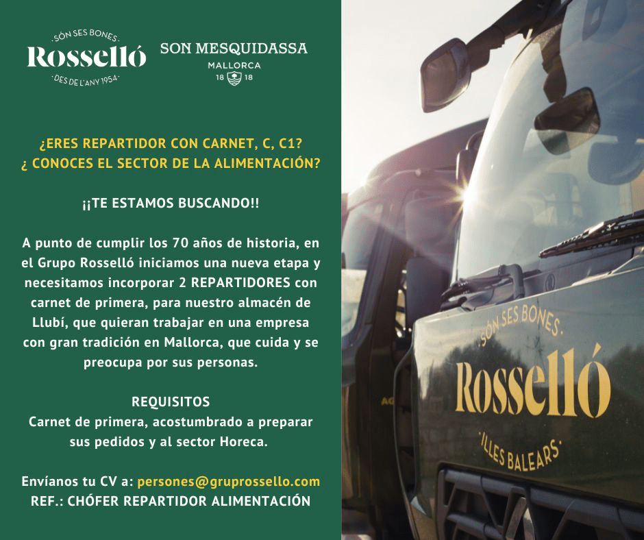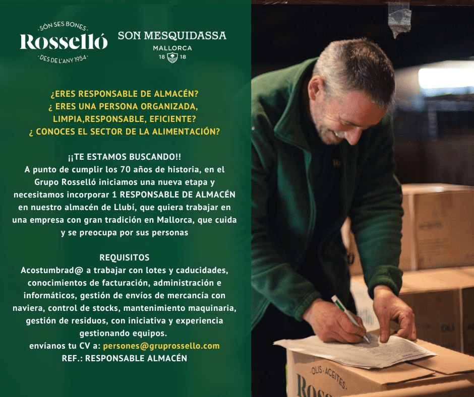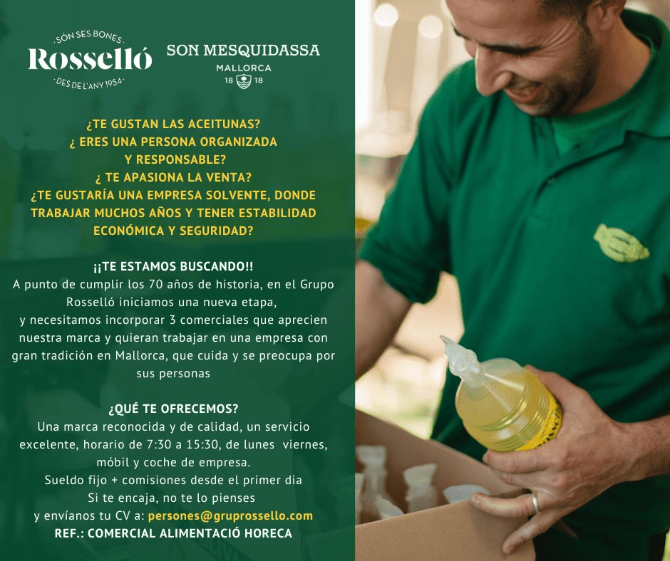 Ofertes de feina. A Olives Rosselló cerquen personal: comercials, responsables de magatzem i repartidors-res Publicat el 22 Novembre 2022 per #enClauJove Ajuntament de Llucmajor www.olivesrossello.com Comparteix això: Feu clic per compartir a X (S'obre en una nova finestra) X Feu clic per compartir al Facebook (S'obre en una nova finestra) Facebook M'agrada S'està carregant... Relacionats