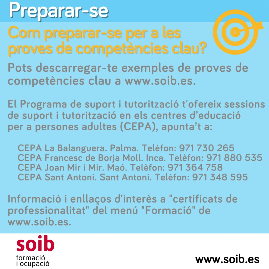 Les proves de competències clau es fan a alguns centres d’educació per a persones adultes (CEPA). Et pots inscriure a la teva oficina SOIB, a la xarxa POAP, als centres que imparteixen formació del SOIB i als CEPA de la llista següent: