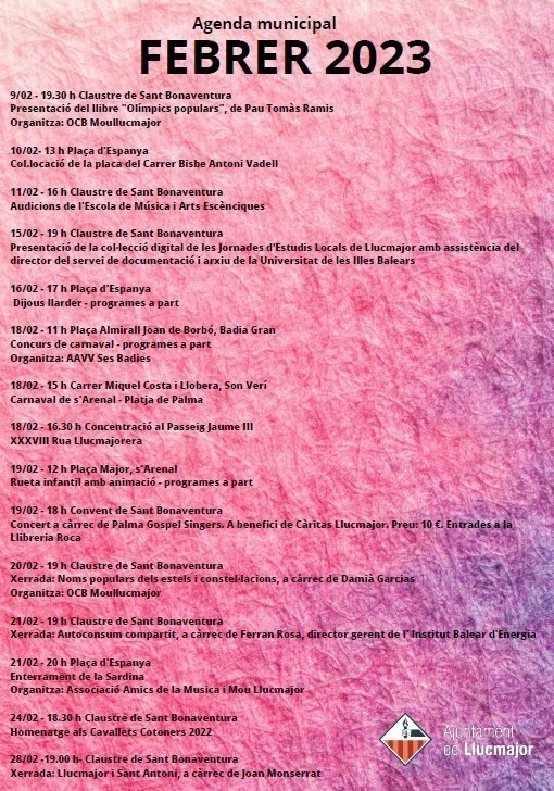 Agenda FEBRER Imatge Publicat el 3 febrer 2023 per #enClauJove Ajuntament de Llucmajor Comparteix això: Feu clic per compartir a X (S'obre en una nova finestra) X Feu clic per compartir al Facebook (S'obre en una nova finestra) Facebook M'agrada S'està carregant... Relacionats
