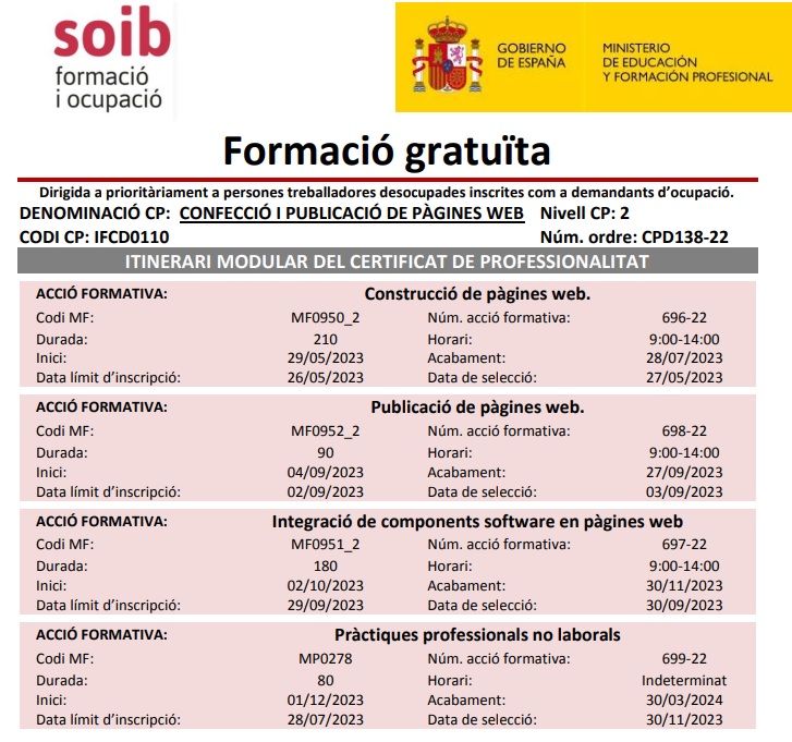 Consulta el programa formatiu: https://sede.sepe.gob.es/especialidadesformativas/RXBuscadorEFRED/DetalleEspecialidadFormativa.do?metodo=modulada&codEspecialidad=IFCD0110&volver=true&idBusquedaFormacion=&volverUrl