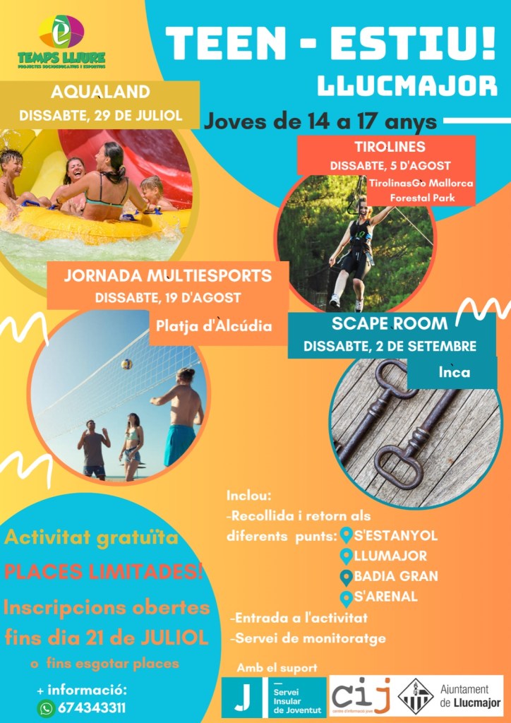 Des de l’Àrea de Joventut de l’Ajuntament de Llucmajor aquest estiu s’ofereixen quatre sortides lúdiques per a joves de 14 a 17 anys (2009-2008-2007-2006) del terme municipal de Llucmajor:
