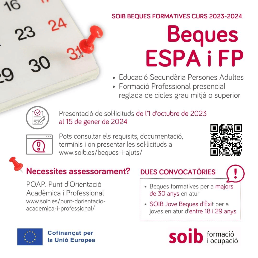 SOIB Jove Beques d’Èxit per a joves en atur d’entre 18 i 29 anys, per cursar Educació Secundària per a Persones Adultes (ESPA) i cicles grau mitjà o superior de FP presencial reglada