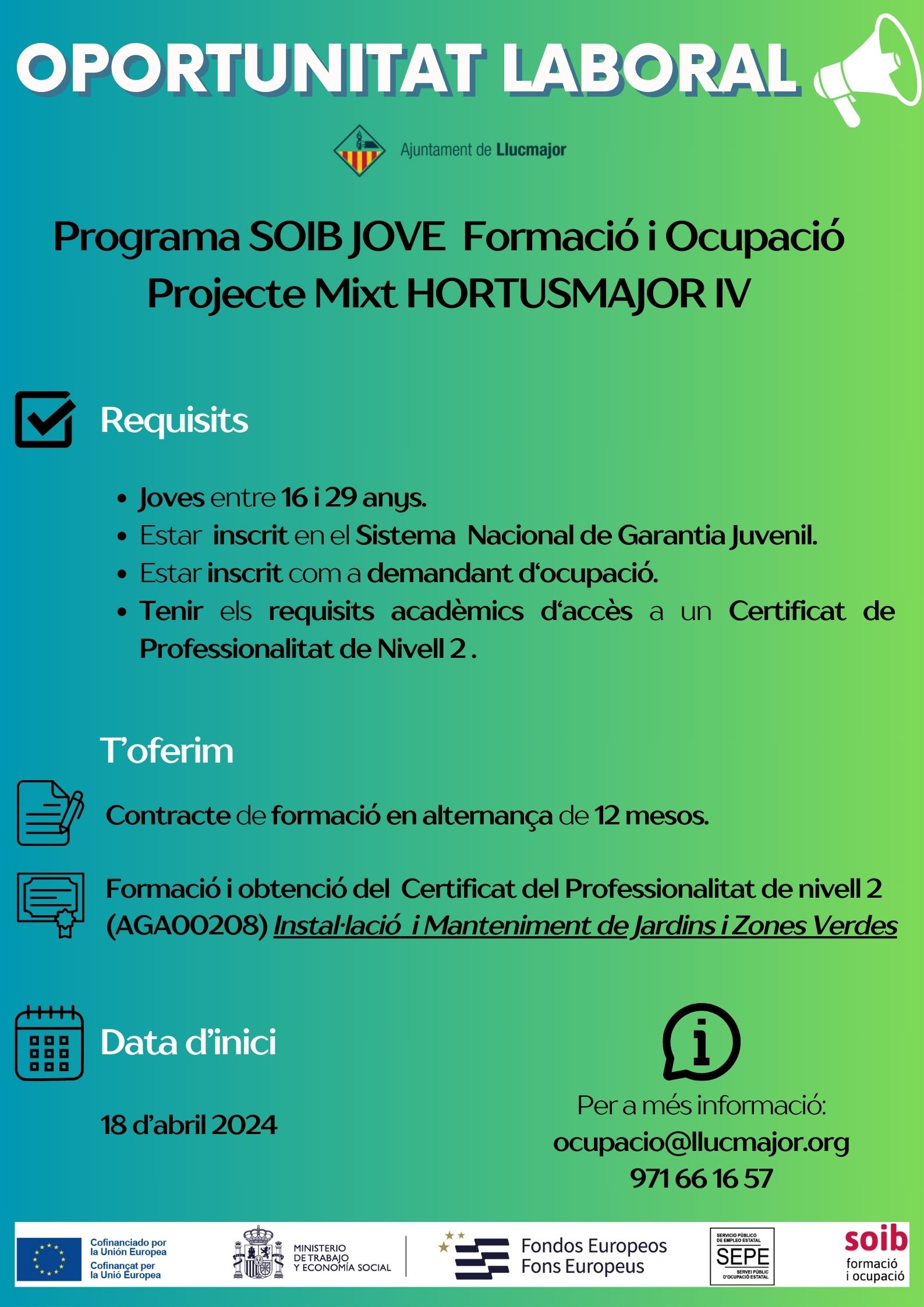 En breu s’obrirà el termini d’inscripció per al projecte mixt HORTUSMAJOR IV Ajuntament de Llucmajor SOIB per a joves de 16 a 29 anys Llucmajor Formació Ocupació