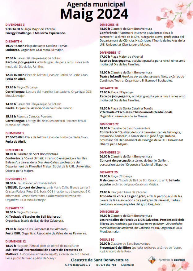 Agenda d’activitats terme municipal de Llucmajor- maig 2024 Publicat el 30 Abril 2024 per #enClauJove Ajuntament de Llucmajor agenda-municipal-maig-2024Descarga Comparteix això: Feu clic per compartir a X (S'obre en una nova finestra) X Feu clic per compartir al Facebook (S'obre en una nova finestra) Facebook M'agrada S'està carregant... Relacionats