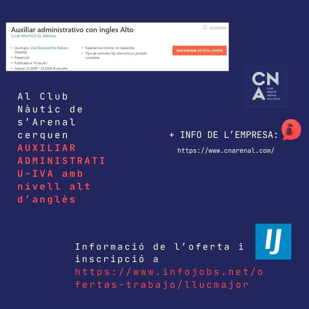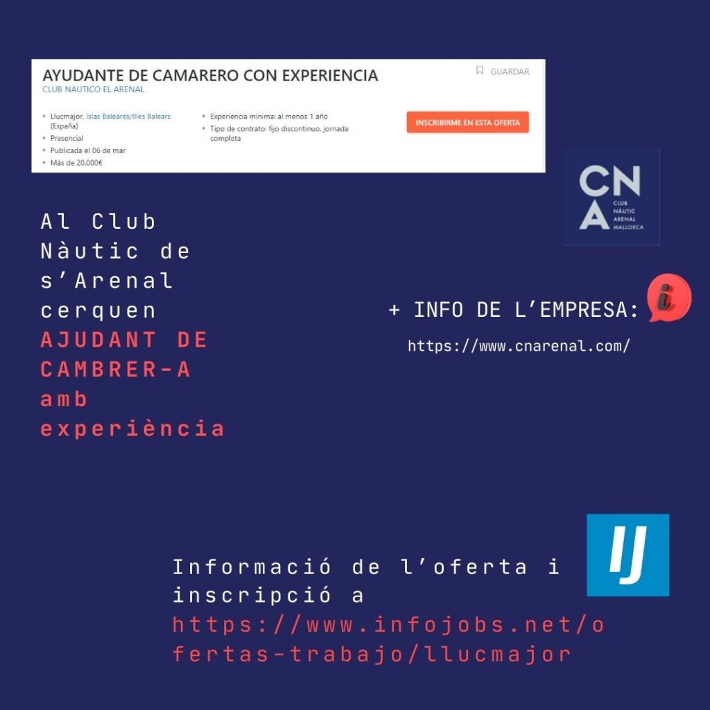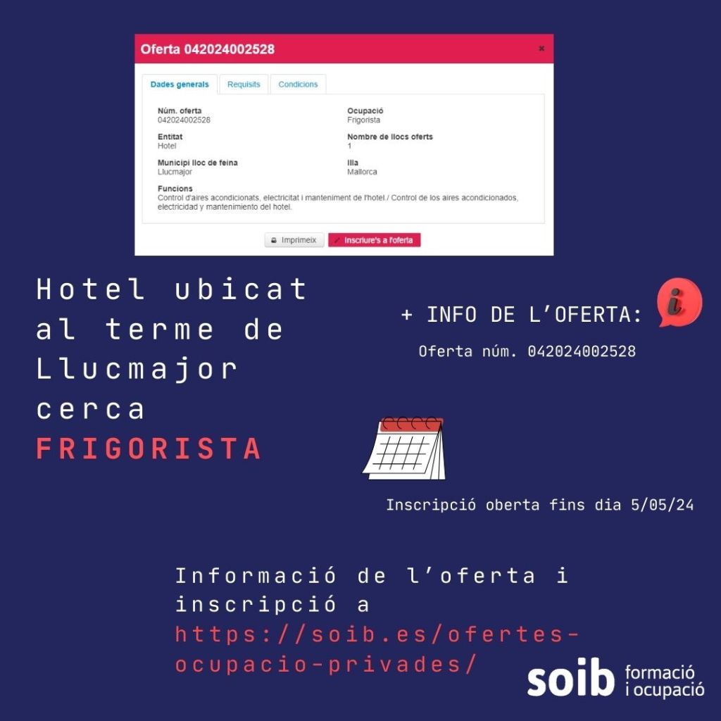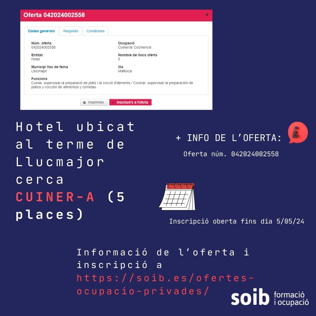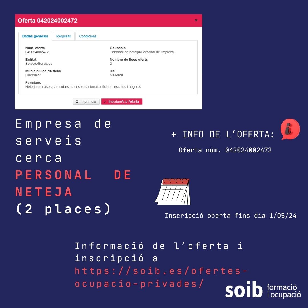 Club de feina- Setmana 29/04/24 Publicat el 30 Abril 2024 per #enClauJove Ajuntament de Llucmajor #feinesaLlucmajor Recull setmana d’ofertes de feina al terme municipal de Llucmajor Comparteix això: Feu clic per compartir a X (S'obre en una nova finestra) X Feu clic per compartir al Facebook (S'obre en una nova finestra) Facebook M'agrada S'està carregant... Relacionats