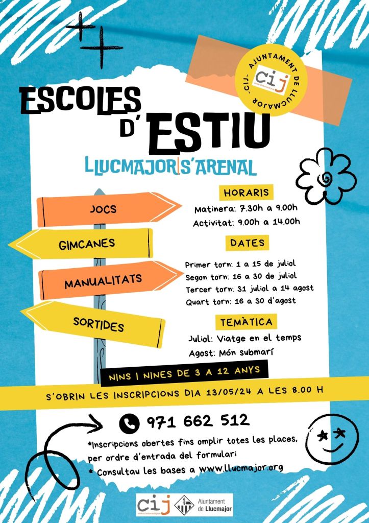 Un any més us proposam una escola d’estiu divertida, creativa i educativa, als poliesportius municipals de Llucmajor i s’Arenal. La temàtica del mes de juliol serà un viatge en el temps i, la del mes d’agost, el món submarí.
