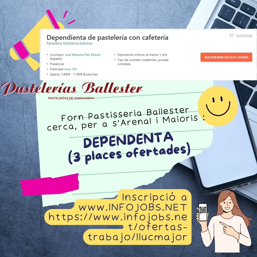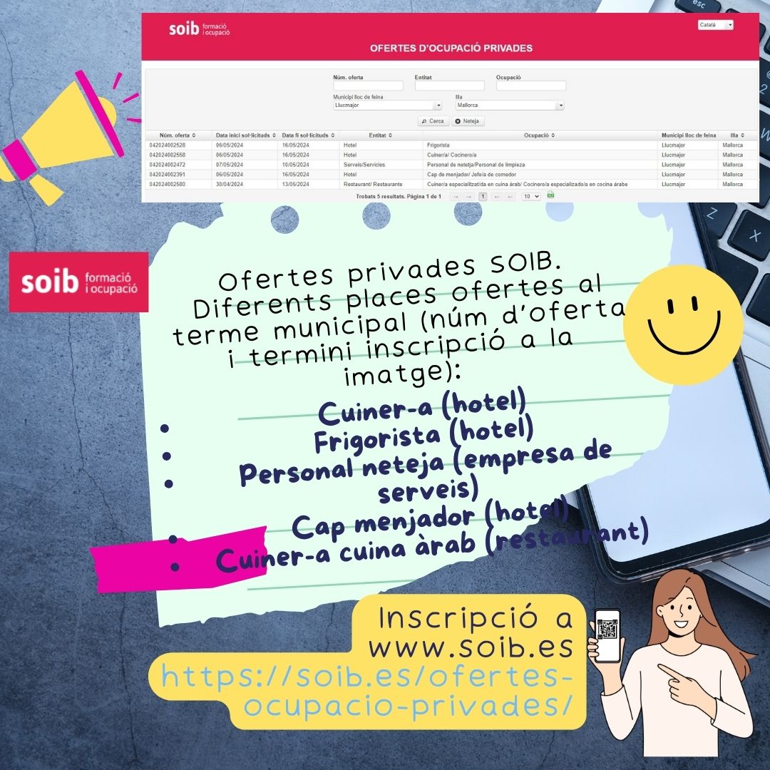 Tota la informació i inscripció a : https://soib.es/ofertes-ocupacio-privades/ Accedeix al cercador d’ofertes privades, filtra per municipi (Llucmajor) i veuràs totes les ofertes del terme municipal