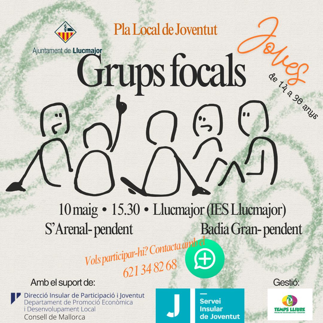 Grups focals- Pla Local de Joventut Publicat el 3 Juny 2024 per #enClauJove Ajuntament de Llucmajor Com a part de l’elaboració del Pla local de Joventut es duran a terme grups focals dinàmics i pràctics a Llucmajor, S’Arenal i Badia Gran. T’hi animes a participar? Contacta per whatsapp amb en Dani al 621 34 82 68. Comparteix això: Feu clic per compartir a X (S'obre en una nova finestra) X Feu clic per compartir al Facebook (S'obre en una nova finestra) Facebook M'agrada S'està carregant... Relacionats