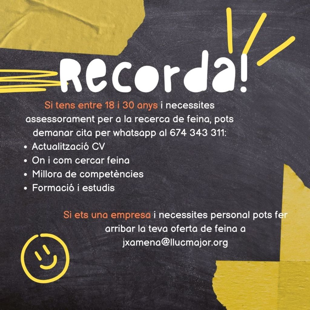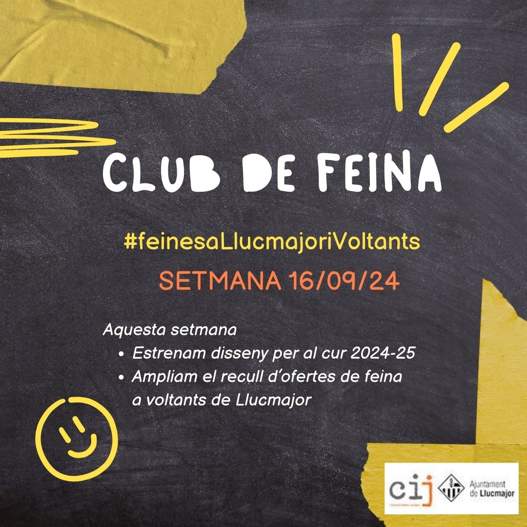 Club de feina setmana 16/09/24 Publicat el 17 Setembre 2024 per #enClauJove Ajuntament de Llucmajor Comparteix això: Feu clic per compartir a X (S'obre en una nova finestra) X Feu clic per compartir al Facebook (S'obre en una nova finestra) Facebook M'agrada S'està carregant... Relacionats