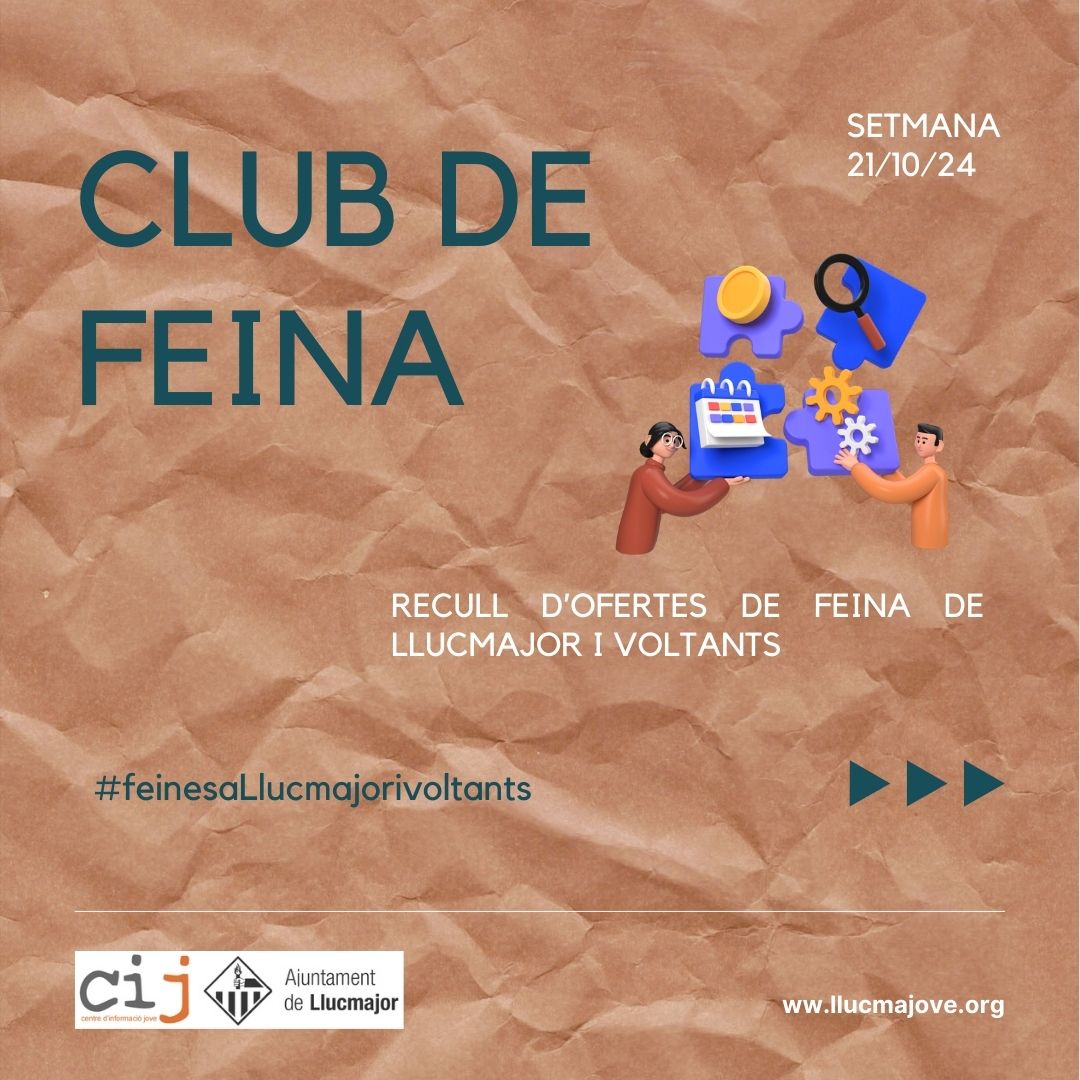 Club de feina setmana 21/10 Publicat el 23 Octubre 2024 per #enClauJove Ajuntament de Llucmajor #feinesaLlucmajorivoltants Comparteix això: Feu clic per compartir a X (S'obre en una nova finestra) X Feu clic per compartir al Facebook (S'obre en una nova finestra) Facebook M'agrada S'està carregant... Relacionats