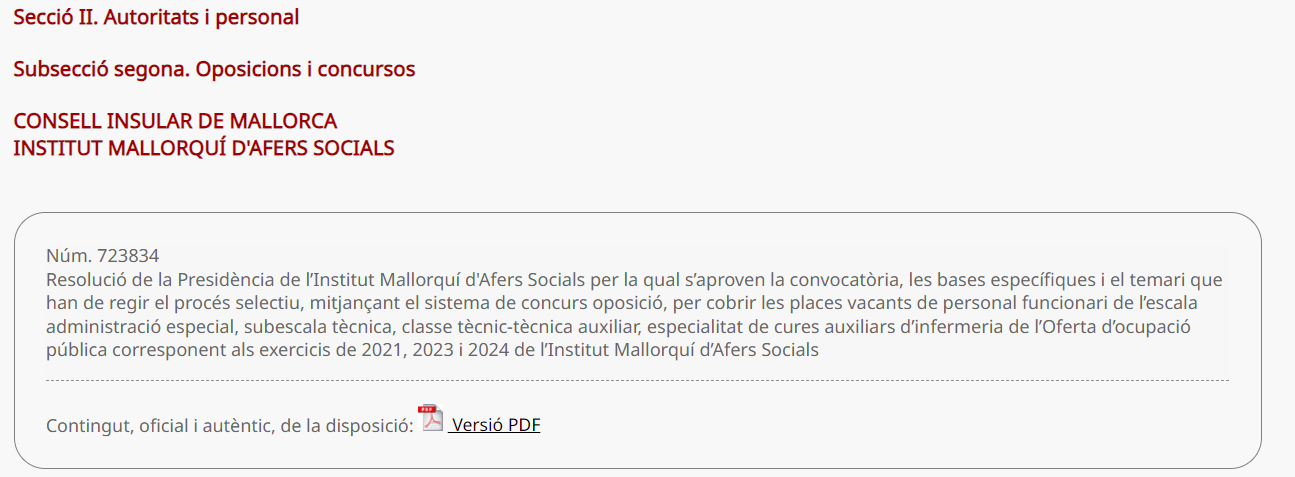 Convocatòria, bases específiques i temari que han de regir el procés selectiu, mitjançant el sistema de concurs oposició, per cobrir les places vacants de personal funcionari de l’escala administració especial, subescala tècnica, classe tècnic-tècnica auxiliar, especialitat de cures auxiliars d’infermeria de l’Oferta d’ocupació pública corresponent als exercicis de 2021, 2023 i 2024 de l’Institut Mallorquí d’Afers Social