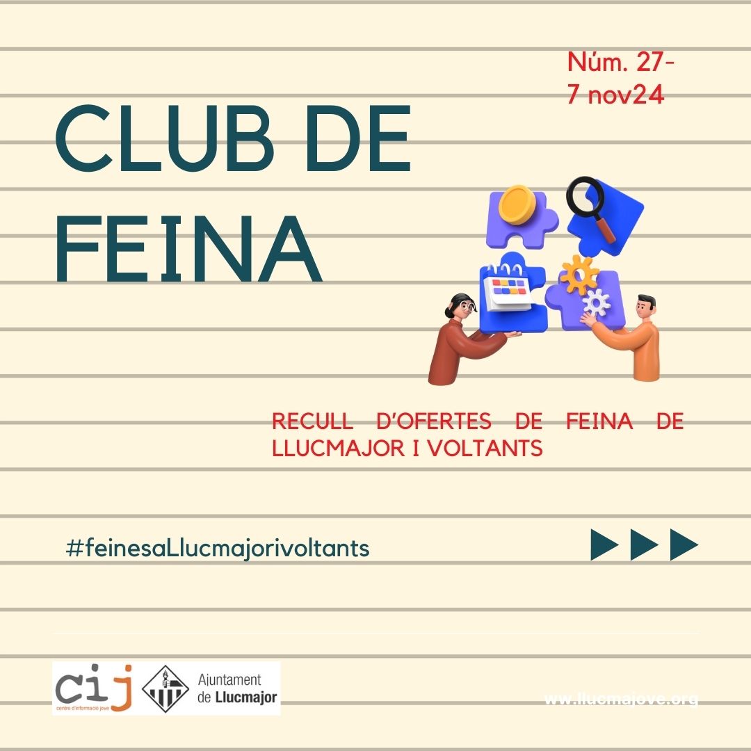 Club de feina. Núm. 27- 7/11/24 Publicat el 8 Novembre 2024 per #enClauJove Ajuntament de Llucmajor #feinesaLlucmajorivoltants Aquí teniu el darrer recull d’ofertes de feina Comparteix això: Feu clic per compartir a X (S'obre en una nova finestra) X Feu clic per compartir al Facebook (S'obre en una nova finestra) Facebook M'agrada S'està carregant... Relacionats