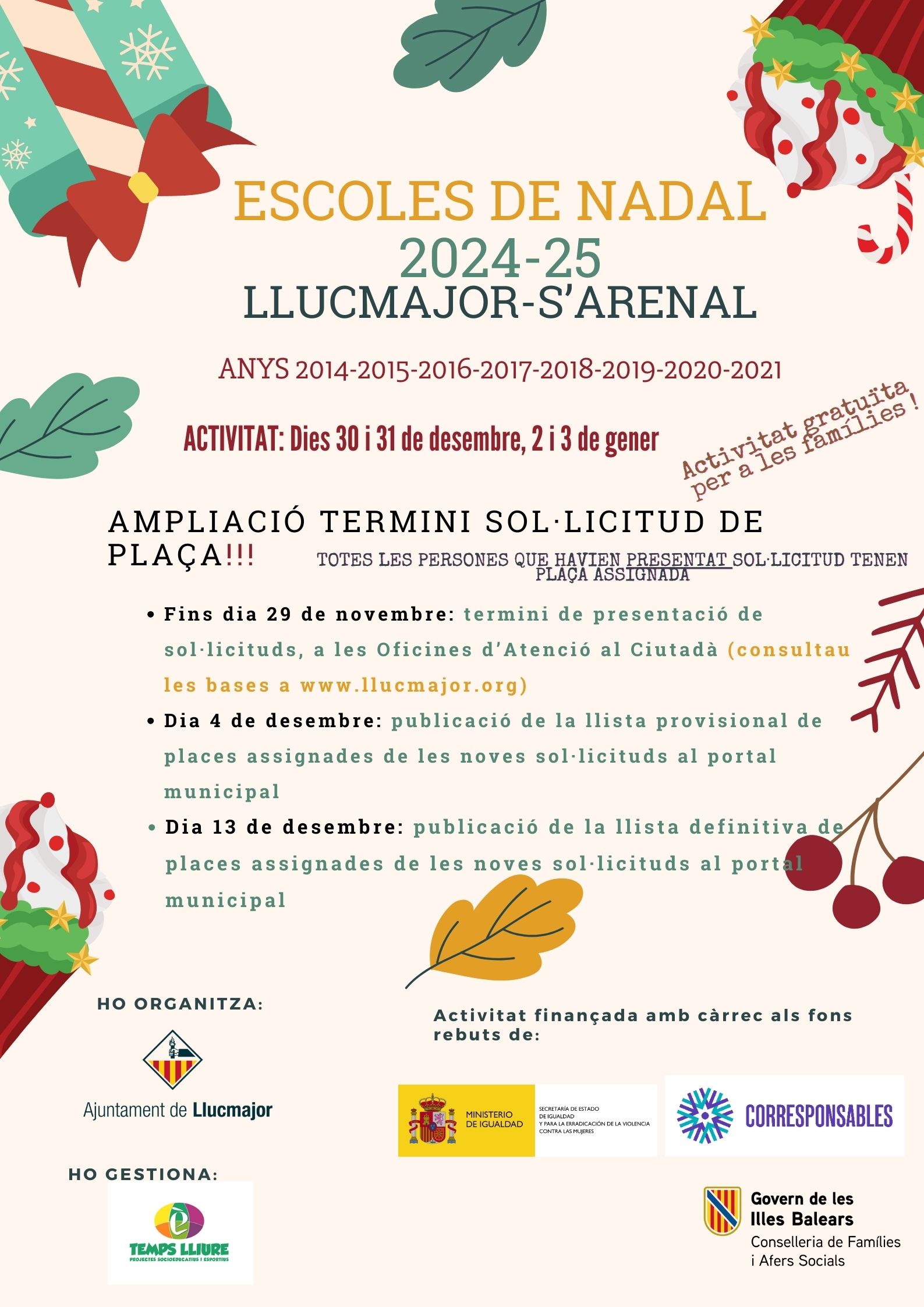 - Nou termini de presentació de sol·licituds obert fins dia 29 de novembre de 2024, en els mateixos termes que els prevists a les bases de l’assignació de places. Podeu consultar les bases a: Escoles de vacances de Nadal 2024-25 – Ajuntament de Llucmajor