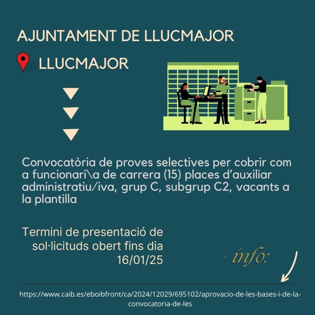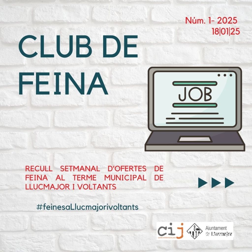 Club de feina núm.1-2025. 8/01/25 Publicat el 8 gener 2025 per #enClauJove Ajuntament de Llucmajor #feinesaLlucmajorivoltants 📲📲 Clica damunt la imatge de cada oferta i entraràs a l’enllaç d’informació i inscripció Comparteix això: Feu clic per compartir a X (S'obre en una nova finestra) X Feu clic per compartir al Facebook (S'obre en una nova finestra) Facebook M'agrada S'està carregant... Relacionats