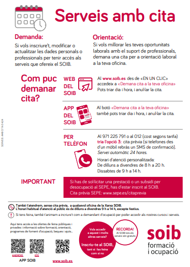 Si vols inscriure’t, modificar o actualitzar les dades personals o prefessionals per tenir accés als serveis que ofereix el SOIB (servei de demanda) o si vols millorar les teves oportunitats laborals pots demanar cita a la teva oficina del SOIB (servei d’orientació).