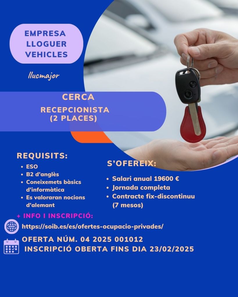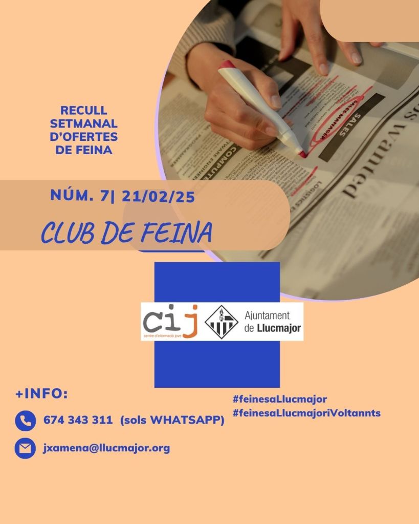 Club de feina núm. 7 | 2025 Publicat el 21 febrer 2025 per #enClauJove Ajuntament de Llucmajor Aquí tens el recull setmana d’ofertes de feina. #feinesaLlucmajoriVoltants Comparteix això: Feu clic per compartir a X (S'obre en una nova finestra) X Feu clic per compartir al Facebook (S'obre en una nova finestra) Facebook M'agrada S'està carregant... Relacionats