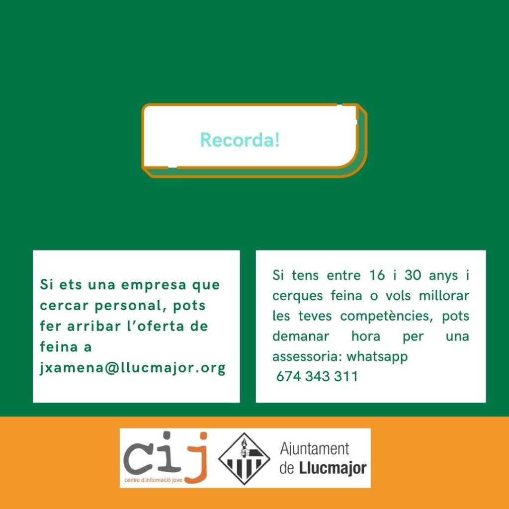 I recorda que si tens entre 16 i 30 anys, cerques feina i vols millorar les teves competències o la presentació del teu CV pots demanar cita per una assessoria al whatsapp 📲📲 674343311