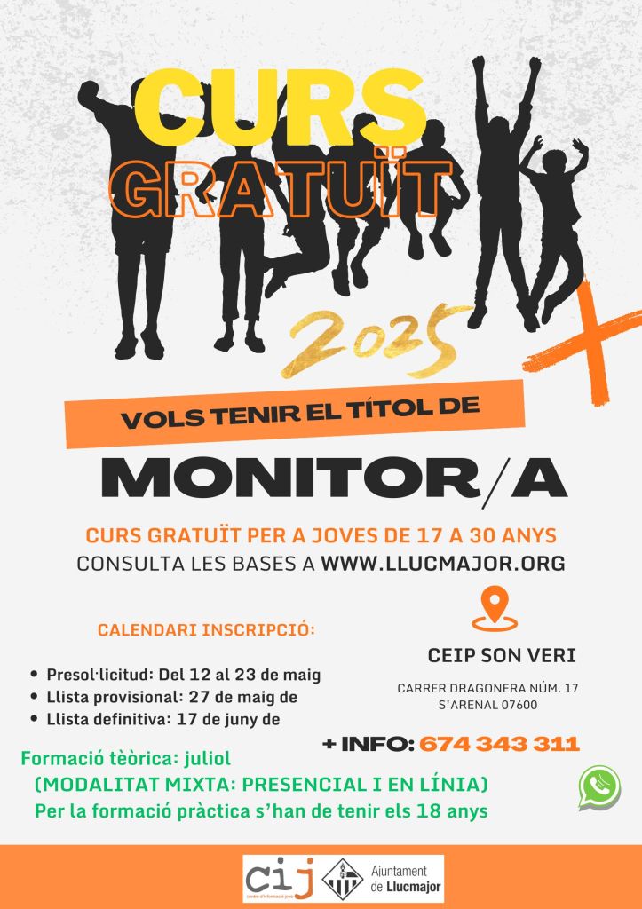 L’Ajuntament de Llucmajor torna organitzar el curs de dinamització d’activitats de lleure educatiu infantil i juvenil (curs per obtenir el títol de monitor/a). Amb aquest títol pots desenvolupar activitats de voluntariat a associacions clubs d’esplai, … i també pots fer feina.
