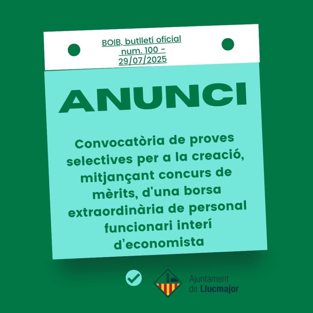 📌📌 Convocatòria i les bases que han de regir les proves selectives per a la creació, mitjançant concurs de mèrits, d’una borsa extraordinària de personal funcionari interí d’economista