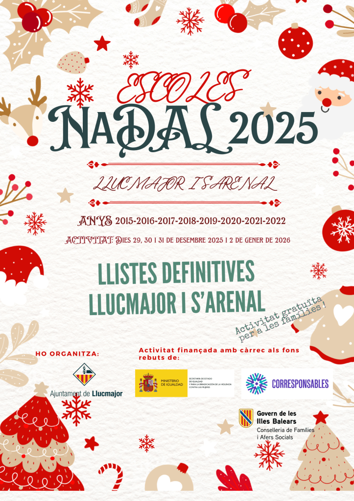 Podeu consultar les llistes definitives de nins i nines admesos/es a les escoles de Nadal 2025 a Llucmajor i S’Arenal.