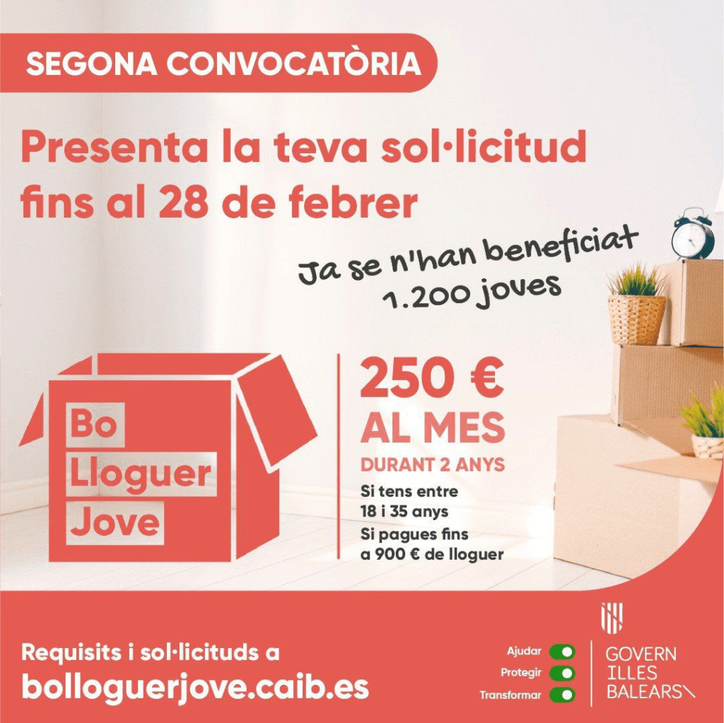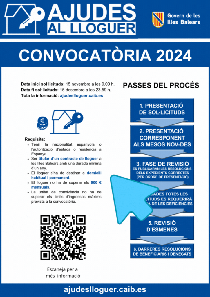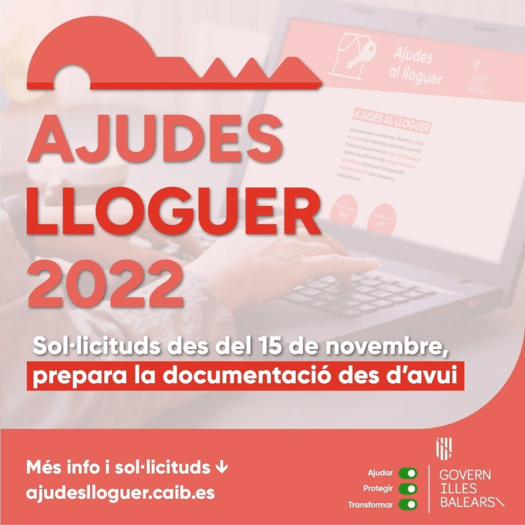 Dia 15 de novembre, a les 9.00 h, s’obri el termini de sol·licitud de l’ajuda al lloguer 2024! El tràmit es realitza des d’aquest enllaç: Ajudes lloguer d’habitatge 2024- caib