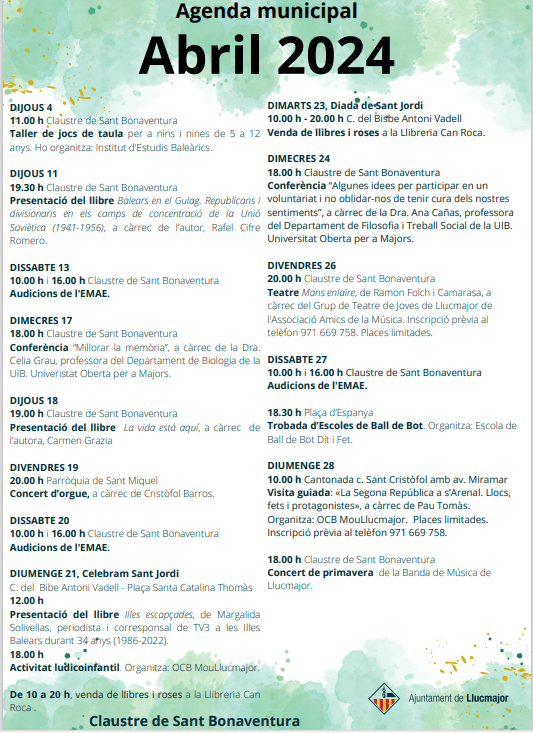 Agenda municipal del mes d’abril Publicat el 3 Abril 2024 per #enClauJove Ajuntament de Llucmajor Respon Agenda municipal abrilDescarga